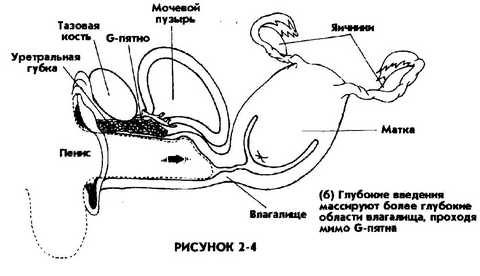 мужчины, чей половой член в возбужденном состоянии достает до их живота. Если женщина хочет, чтобы ее G-ПЯТНО стимулировалось более непосредственно, может потребоваться смена позиции. Одним из способов может оказаться ввод полового члена сзади. Часто эффективное и непосредственное воздействие оказывают пальцы. Для того, чтобы лучше добраться до этого места, стимулирующая себя женщина может выбрать позу на корточках или лежа на спине с поднятыми вверх ногами. Ее партнеру может оказаться легче достигнуть этого места, если она лежит на животе. Если во время полового акта женщина расположена сверху, то она довольно точно может выбрать позицию для такой стимуляции (рис. 24 (а) и (б)).