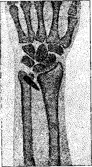 На рисунке 13 представлен рентгеновский снимок руки раненого. На снимке ясно видно, что пуля застряла в кости. По этой фотографии видно, какое мощное оружие для медицины и, в частности» для хирургии представляют рентгеновы лучи. Имея перед собой такой снимок, военный хирург видит всю картину повреждений, нанесённых ранением, производит как бы бескровное и безболезненное вскрытие человеческого тела.