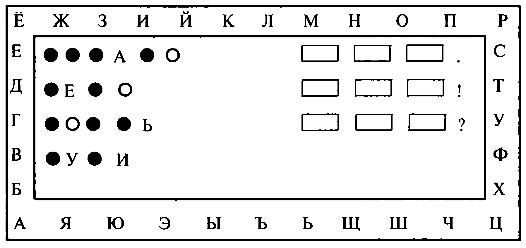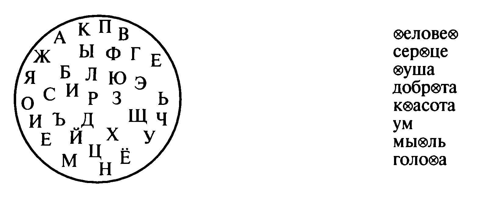 При таком анализе слов дети постепенно усваивают практически весь звуковой состав речи. Вместе с тем учитель каждый день, начиная с первого учебного дня, на уроке показывает детям записанные им на доске буквы алфавита. Обычно мы их на доске записываем двумя способами: или вдоль краев доски в полоску, или же в большом круге. Детям предлагается назвать, кто знает букву, которую показывает учитель указкой. На это занятие уходит две-три минуты. В классе и в коридоре на стенах (на уровне детей) вывешены плакаты с полным алфавитом. Дети сами собираются вокруг плакатов, ищут на них знакомые буквы, учат их друг другу, учатся друг у друга. Получается, что за несколько дней каждый ребенок знакомится почти со всем алфавитом. Пользуясь этим стремлением детей и накопленным опытом записи и чтения слов с помощью кружочков, а потом кружочков и гласных, учитель может в качестве пробы предложить детям прочесть слова, написанные кружочками и буквами. Скажем, дается детям следующая запись слов, часть которых на прошлых уроках уже была записана кружочками, проанализирована и т. д.