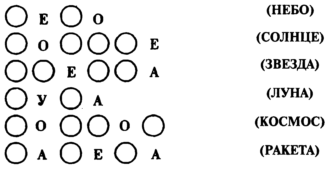 На этот раз слова записаны с помощью кружочков и гласных букв. Для такого рода задания выбираются те слова, которые дети на прошлых уроках уже