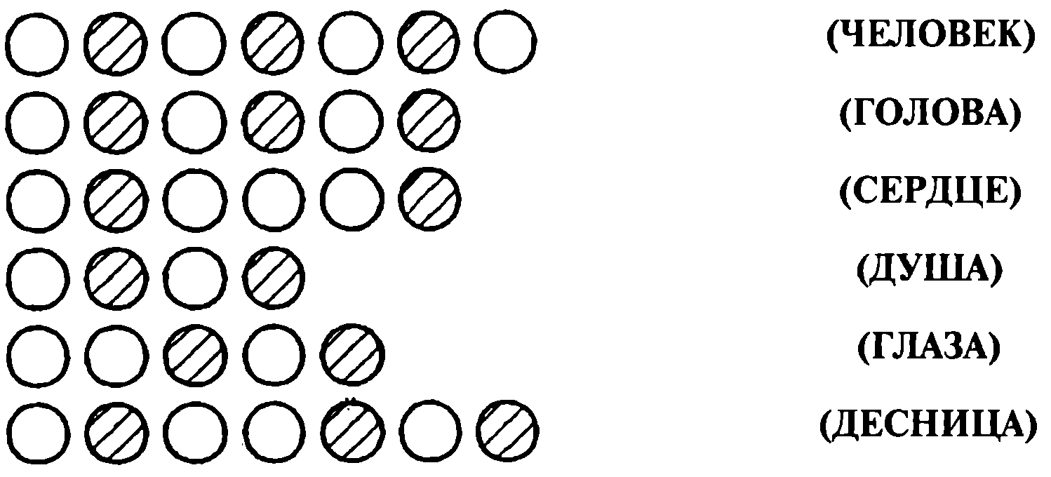 Задания учителя: Посмотрите, пожалуйста, записано ли здесь слово сердце? («Да. На третьем месте сверху».) А слово голова? («На втором месте сверху».) А слово палец? («Нет такого слова в записи».) Простите, хотел сказать слово глаза («На втором месте снизу») и т. д.
