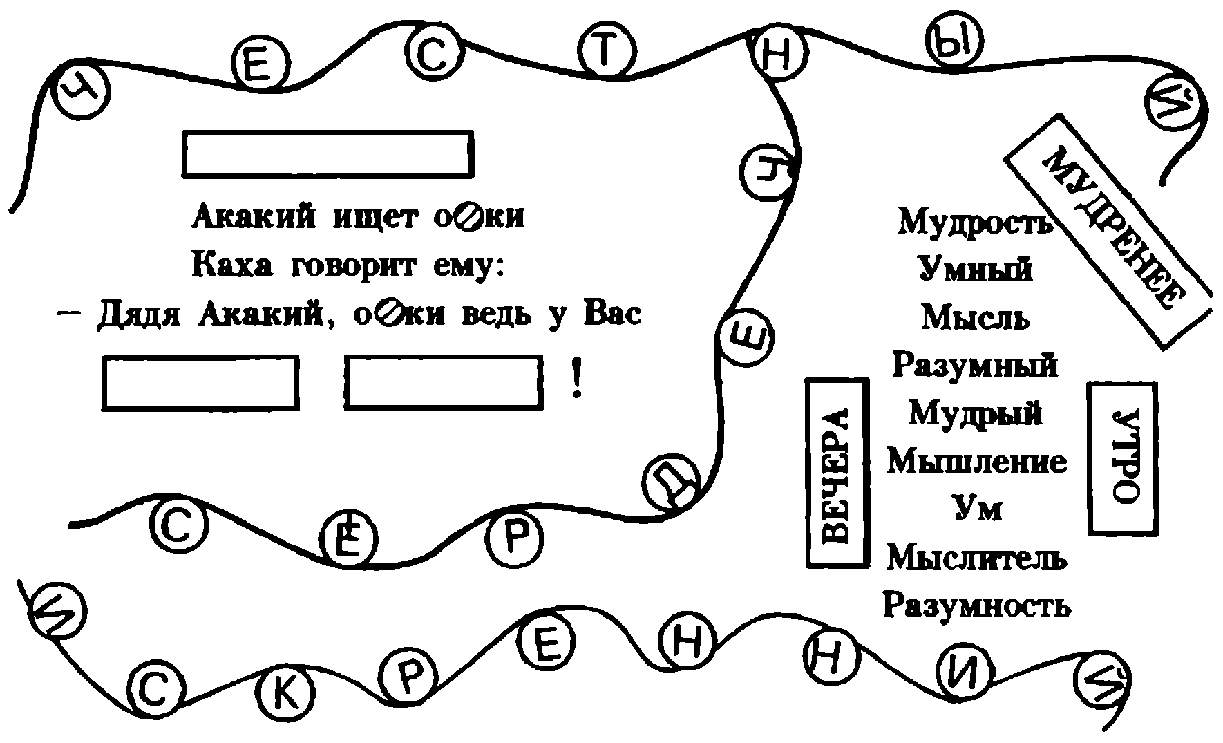 Одна из них «слово в цепочке». На любом свободном месте доски, оставшемся после записи на ней разных задач и заданий, можно зарисовать цепочку с петлями, и в петлях записать слово по буквам. Желательно, чтобы расстояние между петлями было длинное, чтобы петлю приходилось искать среди других заданий, чтобы цепочка загибалась то влево, то вправо, вверх, вниз. Именно такие завороты и расстояния между петлями делают слово секретным.