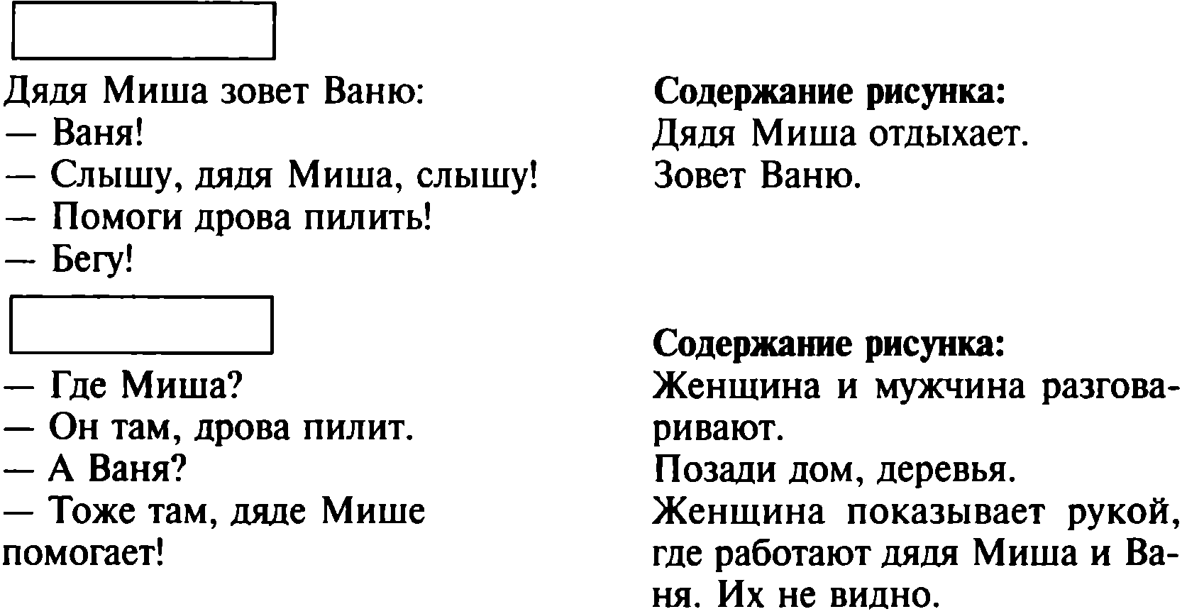 Будем считать, что в этих текстах материализована кружочками буква п, а приглашена буква т. Букву эту еще не изучили, но дети ее знают. Этот блок текстов предлагается детям на ранней стадии букварного периода. Содержание текстов, как видите, не очень богатое, но тем не менее дает основание читать их с интересом. Причин заинтересованности несколько. Во-первых, само разнообразие текстов повествовательный, диалогический поощряет детей к их чтению. Во-вторых, разные рисунки к текстам заранее настраивают детей на восприятие информации, на понимание содержания каждого. В-третьих, в каждом из текстов они узнают что-то новое об одном и том же: в первом говорится о том, что дядя Миша работает, Ваня играет, в следующем дядя зовет Ваню помочь ему, в последнем же другие люди говорят о том, чем заняты дядя Миша и Ваня.