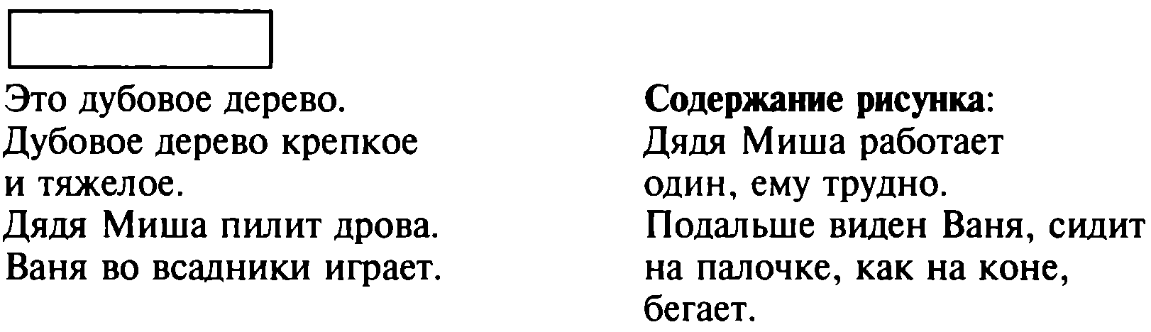 Процесс развития и выращивания познавательного чтения не исчерпывается только чтением текстов, какими бы они ни были. То, что последует после чтения, должно помочь ребенку научиться глубже осмысливать содержание текста, возвращаться к нему с целью уточнения воспринятого содержания. Однако что в приведенных текстах нужно осмыслить глубже? Это будет зависеть от содержания того разговора, который поведет учитель с детьми, да еще и от тех задач, которые предлагают сами тексты. Обращаю сперва Ваше внимание, уважаемый Учитель, на прямоугольные рамки, которые стоят над каждым маленьким рассказом. Это есть форма одной из познавательных задач, которые могут быть предложены детям вместе с текстом, она означает, что нужно озаглавить рассказ. Назову и некоторые другие формы: такие же рамочки вставляются внутри или в конце текста вместо какого-либо пропущенного слова или предложения, в конце текста строчка заполнена точками в знак того, что нужно привлечь фантазию и логику и досказать текст, текст заканчивается вопросом, который наводит ребенка на размышление, и др. Потом я приведу образцы некоторых таких текстов.