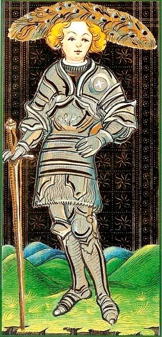 Благородный рыцарь, умоляю, отдай мне свое снаряжение и оружие! (На миниатюре Королева Мечей представлена в доспехах в браслетах, налокотниках, железных наручах, виднеющихся из-под белоснежных шелковых расшитых рукавов.) Я легкомысленно пообещала принадлежать тому, о чьих объятиях мне теперь невыносимо даже думать, и сегодня ночью он станет требовать, чтоб я сдержала обещание! Я чувствую, он уже близко! Но если я буду в доспехах, он до меня не доберется! Ах, защити бедную девушку!