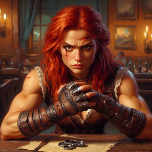 В её облике сочеталось упрямство, храбрость и почти кукольная миловидность. Помимо шрама на лбу, заметил ещё один под глазом, в виде вертикальной полосы. Руки были обнажены до плеч, и каждая мышца читалась чётко. Особенно в глаза бросались развитые бицепсы. Запястья спрятались под грубыми наручами с заклёпками, а кожаная жилетка, плотно облегающая тело, подчёркивала мощную грудную клетку и тонкий стан.
