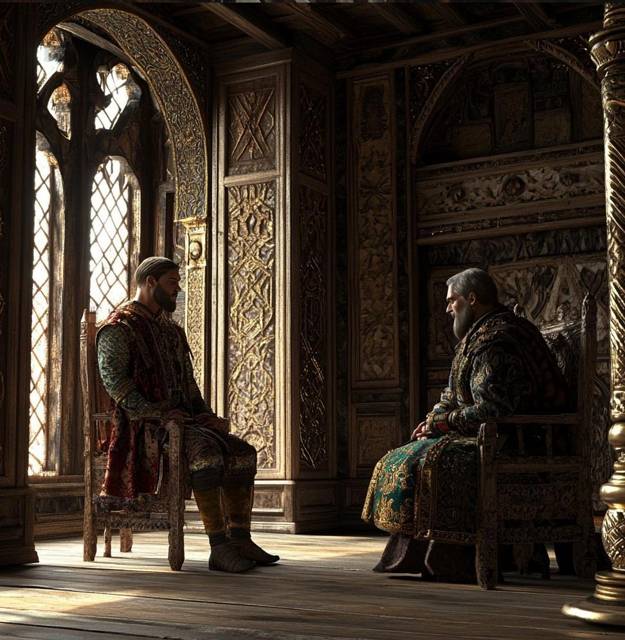 Киев, княжеский терем. Сквозь узкие окна пробивается утренний свет, высвечивая пылинки в воздухе. Игорь, восседая на троне, потягивает медовуху из резного кубка. Киевский трон больше похож на грубо сколоченную скамью, чем на символ власти. Игорь мечтает заменить эту неудобную штуку на нечто более подходящее. Предыдущий Великий князь этим не озаботился, Святославу все походы нужны были. А Игорь другой. На его лице играет легкая, едва уловимая ухмылка. Перед ним, чуть поодаль, стоит Драган, в потрепанных одеждах, но с узнаваемой выправкой наемника. Его уставшая поза говорила о том, что его тело еще не совсем отошло от пережитого. А на лице читается смесь недоумения и осторожного интереса.