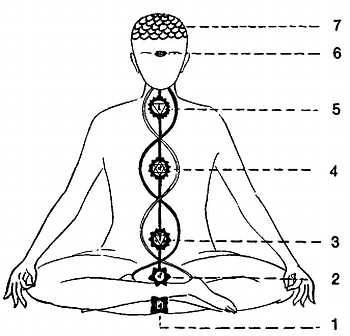 Йоговские противоположные начала ида и пингала (инь и ян по китайской терминологии) связаны с потенциальным восходящим током сушумной и с системой «кругов» чакр, располагающихся снизу вверх в следующем порядке.