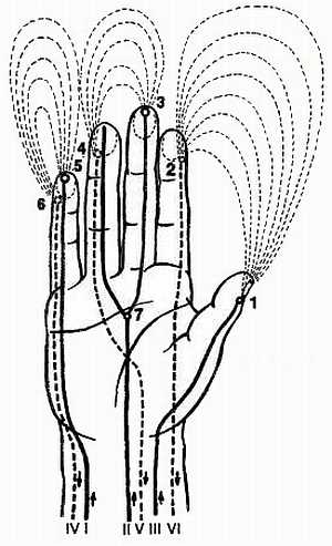 В чисто познавательных целях стоит здесь привести и некоторые сведения, почерпнутые из очень старых книг по «магнетическому» лечению руками. В них указывается, что возложение рук вызывает энергетическое насыщение организма больного, функциональное оздоровление того органа, на который непосредственно оказывается воздействие. Было замечено, что наложение ладони успокаивает, а прикосновение разведенными пальцами возбуждает.