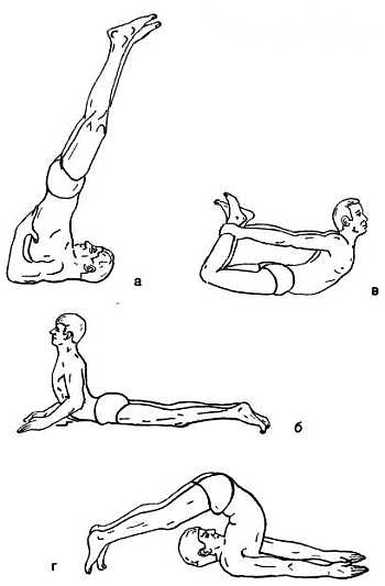 Упражнение «плуг». Исходное положение лежа на спине. Руки располагаются вдоль тела. Соединенные вместе прямые ноги с вытянутыми носками очень медленно поднимаются вверх до угла 45° и после некоторой фиксации в этом положении до прямого угла. Затем туловище сгибается и ноги медленно опускаются за голову, касаясь пальцами пола (см. рис. г). В этой позе следует задержаться на 34 с, после чего ноги очень медленно возвращаются в исходное