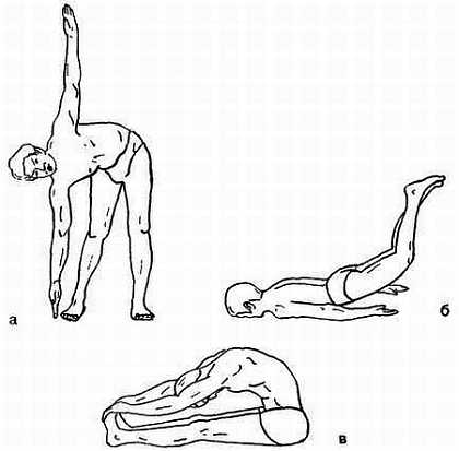 Упражнение «наклон корпуса сидя». Исходное положение наклон сидя с вытянутыми ногами. Руки переносятся за голову, и с вдохом происходит подъем корпуса до вертикального положения. После этого делается выдох и тело наклоняется до касания лбом коленей. Фиксация позы в переднем крайнем положении начинается с 5 с и постепенно доводится до 10 мин. Дыхание в фиксированном положении произвольное. Выпрямление туловища производится медленно. Для молодых людей это упражнение не представляет трудности. Людям среднего возраста на освоение этой позы требуется 24 недели (см. рис. в). Полным людям следует выполнять облегченные варианты упражнения: наклон делается с одной рукой и к одной
