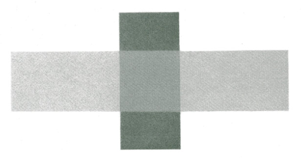 Однако в действительности мы имеем просто серое пятно, которое практически ничем не будет отличаться и от пятна краски, полученного в результате механического смешения, и при восприятии такого пятна никакого разделения или расслоения не происходит, если мы локализуем внимание лишь на нем самом. Возьмем для примера самое простое изображение: темная вертикальная полоса, которую пересекает более светлая и относительно прозрачная горизонтальная полоса, так что вертикальная полоса просматривается через нее. Такое изображение можно воспринимать по-разному: или как две полосы, различно ориентированные и положенные друг на друга, или как пять квадратов, расположенных в одной плоскости. Конечно, глаз будет воспринимать данную ситуацию как две полосы, и, таким образом, светотень окажется расщепленной на два пространственных слоя.