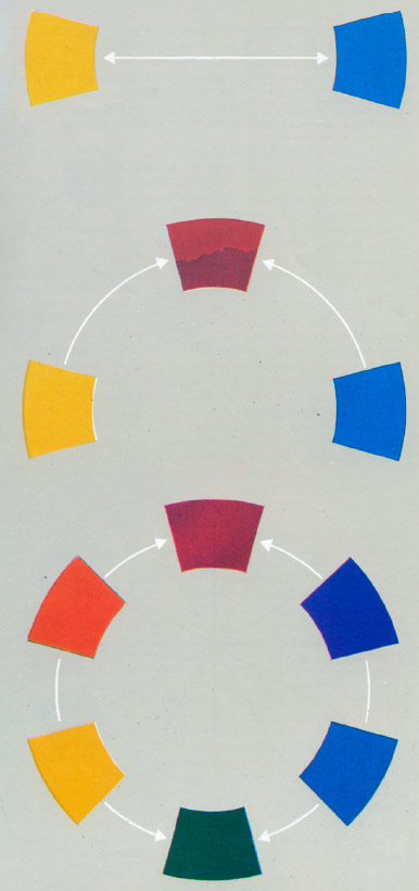 В вершинах треугольника располагаются так называемые основные, или «первичные», чистые цвета: красный, синий, желтый. Смешивая их попарно, можно получить «вторичные», или смешанные, цвета: оранжевый, зеленый, фиолетовый. Смешение можно продолжать и далее и получить таким образом, в конечном итоге, цветовой круг. Если в треугольнике провести биссектрисы, а в круге диаметры, то на их противоположных концах будут лежать взаимодополнительные цвета, о которых речь пойдет ниже.