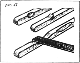 После прокатки пруток отложите в сторону, займитесь вальцеванием следующего бруска. При прокатке все время следите, чтобы на бруске не образовалось заусенцев и трещин. Такое может произойти при сильном обжиме бруска валками, при низкой пробе серебра, требующей более частого отжига, от неравномерности возникающего в процессе вальцевания напряжения, а также при неправильном (неравномерном) отжиге. При возникновении трещин или заусенцев нужно сразу же прекратить прокатку (иначе они будут углубляться и увеличиваться) и обработать брак: выкусить и опилить заусенец или аккуратно выбрать надфилем трещину, пока она не исчезнет (рис. 41), а брусок отжечь, чтобы снять напряжение. Образовавшееся после зачистки углубление при дальнейшей прокатке выровняется.