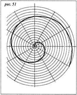 Чтобы выполнить другой элемент большой завиток, нужно изучить характер спирали Архимеда. Начертите центровые линии. Затем, сколько позволит размер бумаги, начертите несколько все увеличивающихся окружностей, имеющих один центр, начиная с радиуса в 5 мм и увеличивая каждый раз на 5 мм: 5, 10, 15, 20, 25 и т. д. Затем поделите самую большую окружность на 12 частей так, как вы делили ее, строя эвольвенту. Поставьте точку 0 на пересечении самой маленькой окружности и вертикальной центровой линии внизу, точка 1 будет находиться на пересечении дуги второй окружности и радиальной линии 1/12, точка 2 на пересечении дуги третьей окружности и радиальной 2/12 и так дальше до последней окружности. Полученные точки соедините плавной кривой. Спираль Архимеда построена (рис. 51).