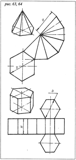 Достаточно часто в изготовлении филигранных изделий применяют развертки призм и пирамид, в том числе и усеченных разными плоскостями (рис. 63, 64).