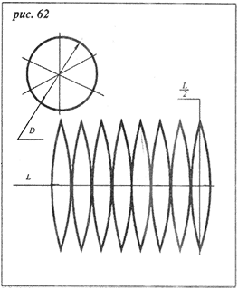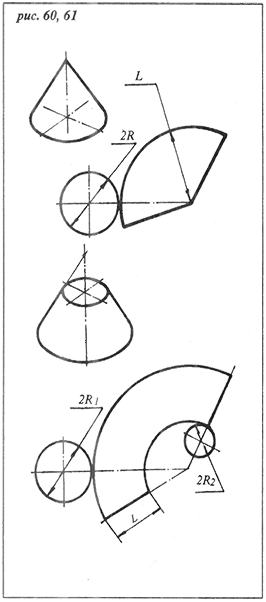 Развертка конуса представляет собой сектор, где дуга равна длине окружности или овала, а радиус его является образующей конуса, и круг или овал (конус, как известно не обязательно в основании имеет окружность) (рис. 60, 61).