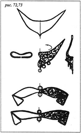 Изображенные на рисунках серьги выполняются по развертке, которая строится сначала на рисунке. По рис. 72 определите, на какие элементы следует разбить контур, чтобы гибка была более качественной. Нарежьте проволоку по заданному размеру и осуществите гибку по рисунку развертки. Торцевые срезы проволоки зачистите надфилем и соберите в общий контур развертки серьги на леткале. После этого стыки контура, смоченные флюсом, спаяйте. Затем следует, совместив контуры, сделать правку и выплощить