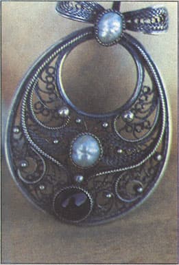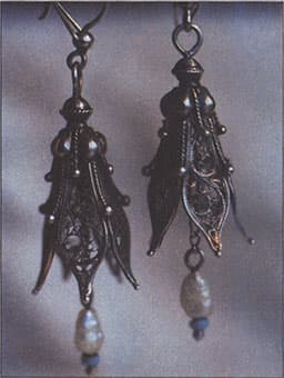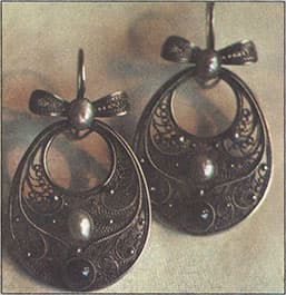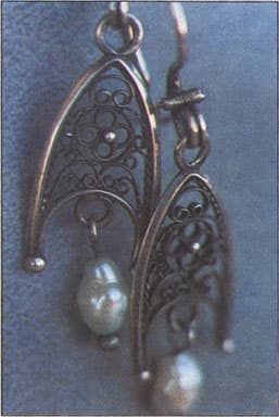 Серьги, выполненные в технике плоской филиграни, с подвесками из жемчуга.