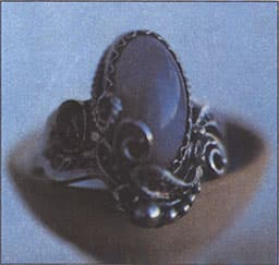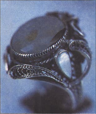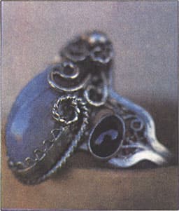 Перстень, выполненный в технике напайной филиграни, с агатом и гранатом. Каст для аметиста декорирован зубчатой дорожкой.
