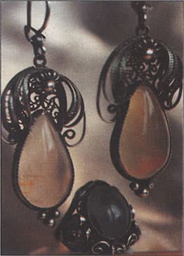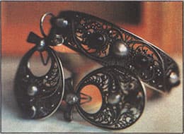 Комплект из серег и перстня, выполненные в технике напайной филиграни. Как фрагмент декора использован элемент «жучок».