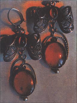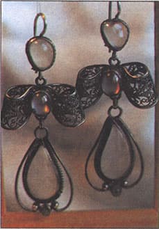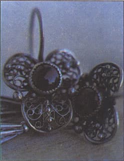 Декорирование основания дужки серьги трилистником, выполненным в технике плоской филиграни и некрупным гранатом в низком касте.