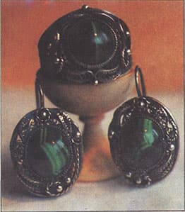 Комплект из серег и перстня с малахитами, выполненный в технике напайной филиграни.