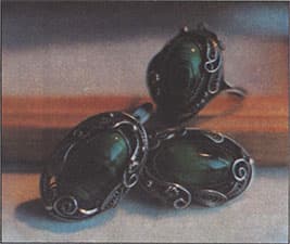 Обрамление гранатов в виде круглых кабошонов и круглых пластин перламутра скаными кастами.