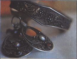 Комплект из серег и браслета. Филигранный фон декорирован по форме рисунка корнерами и дорожками.