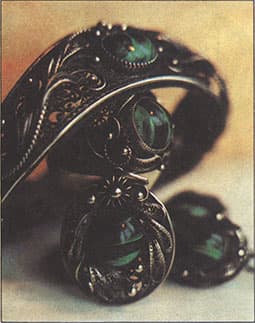 Комплект украшений с малахитами, выполненных в технике объемной филиграни.