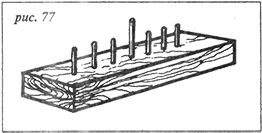 Для изготовления листочков существуют специальные приспособления ленивцы. Ленивец представляет собой небольшую дощечку из дерева твердых пород, на которой в ряд вбиты маленькие гвоздочки (обычно используют швейные иголки) на расстоянии друг от друга примерно 0,71 мм. Головочку выполняют корнцангами. Насаживают ее на средний стержень, а затем навивают вокруг последующих столько оборотов, сколько нужно для требуемого листочка. Такой листочек бывает довольно ровным. Но выполненный вручную листок получается более «живым», с индивидуальными особенностями и никогда не похож на сделанный другим мастером. Изготовить ленивец нетрудно, важно выдержать расстояние между стержнями, чтобы в готовой заготовке расстояние между витками оставалось 0,50,6 мм (рис. 77).