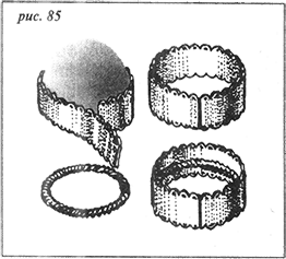 Рундист в два-три раза уже каста. Чтобы камень правильно обрамился кастом, необходимо сделать подложку, которая изготавливается из круглой скани или глади и вкладывается в каст на том уровне, при котором камень установится в нужном положении. Отрежьте кусок круглой скани (из нитей сечением 0,55 мм), выгните по внутреннему контуру каста и вложите в каст так, чтобы он находился параллельно нижнему основанию на требуемой высоте. При этом края проволоки должны сомкнуться. Припаивайте вложенную проволоку к касту. Так же поступите и с другими, проверяя, правильно ли при данном положении подложки лежит камень (к сожалению, рундист, если комплект из камней выполнен не слишком профессионально, может быть разной высоты). Камень должен лежать таким образом, чтобы основная часть каста совпадала с верхним краем рундиста, а зубчики находиться выше. Это нужно для того, чтобы потом, при закрепке камня в касте, завалить зубчики на камень. Подложку, чтобы облегчить изделие, можно выполнить из зубчатой дорожки (см. урок 3), которая изготавливается из глади шириной 1,2 мм. Укладывают, подгоняют и припаивают ее так же, как и скань. Подложку для прозрачных и полупрозрачных камней делают только из зубчатой дорожки, которая не помешает восприятию камня, а окошко в нижнем наборе поможет ему на свету заиграть всеми своими красками.