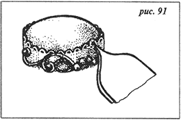 Если все получилось (а у вас должно все отлично получиться), то перстень можно отложить он уже готов к отделочным работам, с серьгами еще придется поработать. Нужно будет изготовить замок для дужки. Согласитесь, столько труда вложено и потерять серьгу. Для этого приготовьте круглую гладь сечением 0,55 и 0,3 мм (небольшие кусочки), чтобы сделать филигранную трубочку. Теперь навивайте тонкую проволоку вокруг толстой длиной 10 мм и осторожно, чтобы не помять контур сечения, снимите (рис. 88). Затем раскусите пополам, отожгите и сдвиньте легонечко пальцами, чтобы просветы между витками исчезли. Смочите флюсом, посыпьте чуть припоя и спаяйте по отдельности трубочки (спаяться должны между собой витки, а не трубочки). Каждую трубочку нужно уложить в место соединения колечка для дужки и контура нижнего набора с обратной стороны, используя при этом подложки из сетки, чтобы верхний набор, чего доброго, не отвалился, смочите флюсом, посыпьте припоем и паяйте широким пламенем, опять же прогревая все изделие целиком, и лишь когда оно нагреется достаточно, перенесите огонь конкретно на трубочку (вы увидите, как она уляжется, чуть поерзав, как бы устраиваясь поудобнее в ложбинке, образованной от соединения колечка и контура) (рис. 89).