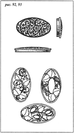 Как уже отмечалось, поиск формы нижнего контура зависит от формы камня, который вы собрались включить в филигранное изделие. Для броши прекрасно подойдут как крупный камень, так и группа некрупных камней, скомпонованных с учетом общего замысла. Вы решите для себя эту задачу и выберете форму контура самостоятельно, равно как и узор внутри контура. Условимся только, что мотив узора будет растительный, потому что в качестве главного элемента внешней наборки хочу предложить листочек более сложной формы, чем выполненный раньше. В верхнем наборе он в принципе может подойти к камню (или камням) любого размера и формы. Пространство броши позволяет использовать в верхнем наборе более крупные элементы, каким и является предлагаемый листок, отдаленно напоминающий смородиновый. Для большого камня он помехой не будет, потому что роль смородинок сыграют крупные корнеры, прекрасно вуалируя каст, а мелкие камни, какой бы формы они ни были, сами сыграют роль неких экзотических ягодок. Два-три средних камня, украшенные корнерами и завитками, возьмут на себя роль причудливых цветков (рис. 92). Не сомневаюсь, что у вас великолепно получится композиция верхнего набора. Нижний же является в напайной филиграни лишь дополнением, и вам не составит труда выложить узор самостоятельно. Композиция узора в овале показана на рис. 93. Начинайте набор с выкладывания скани по контуру нижнего основания броши, стараясь не оставлять зазоров (на больших площадях при пайке контур может деформироваться, а элементы как бы «присаживаться»). Далее выкладывайте основные завитки с двойной головочкой из глади. Помните о том, что все элементы должны касаться друг друга и контура, по крайней мере в трех местах. Не допускайте также образования толщин (как их избежать, описывалось выше). Теперь приступайте к изготовлению нижнего набора. Он должен быть достаточно плотным, так как потом он будет бухтироваться. Если камни у вас полупрозрачные, то на месте их сделайте окошки так же, как было описано в предыдущем уроке.