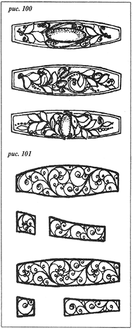 Дальше пайка, выплащивание, приклеивание к бумаге контуров. Хорошо просушенные контуры обязательно усиливают плоской сканью (1,2 мм), а затем выкладывают из глади большие завитки. На рис. 101 показана композиция рисунка гладиевого узора. Возможно, вы предпочтете другой узор. Он может быть выполнен симметрично. Тогда следует начертить ось симметрии и, начиная от нее или с краев, строить композицию узора. Важно, чтобы при соединении звеньев нижнего набора узор, выполненный вами, был как бы непрерывен при мысленном удалении боковых контуров. После глади следует уплотнить узор мелкими элементами из скани. Старайтесь, чтобы набор был равномерным по плотности на всех звеньях. Высушенные наборы следует пропаять, проверяя качество пайки и не допуская непропаев. К одному из крайних звеньев припаяйте колечко, к которому будет присоединена цепочка со стерженьком-замком.