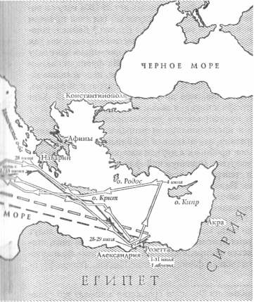 Выйдя из Александрии, британский флот продолжил свой безуспешный поиск французов, преодолев 400 миль, отделявших его от побережья Турции, затем 300 миль, двигаясь в направлении Крита, и еще 700 на запад, к Сицилии. Затем Нельсон снова взял курс на восток. Наконец в районе побережья Греции англичане, захватив французский бриг, выяснили, что флот противника месяц назад видели у берегов Крита и что он двигался на юго-восток. Теперь Нельсон знал, что пунктом назначения французского флота была Александрия. Поэтому он взял курс на Египет и 1 августа прибыл в Александрию.