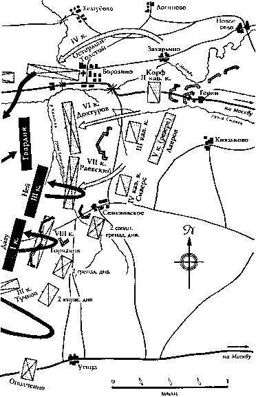 Ситуация стала складываться в пользу русских. Хотя Кутузов был слишком осторожен, чтобы продолжать свое наступление силами крупных подразделений, тем не менее наступление Наполеона было полностью расстроено. На северном участке его силы, которые более часа оставались без поддержки артиллерии, были сильно помяты, а потеря такого огромного количества боеприпасов и более семидесяти пушек во время хаоса, который имел место на этом участке битвы, значительно снижала возможности контрудара. Пленение Мюрата нанесло серьезный удар по моральному состоянию сильно поредевшей французской кавалерии, чьи лошади не шли ни в какое сравнение с ухоженными лошадьми противника. Что касается русских, то отсутствие давления на «Большую батарею» позволяло им перебрасывать к флешам свои силы с северного участка, и все же у них уже не хватало подразделений, которые можно было бы ввести в сражение. Значительная часть их артиллерии была повреждена, боеприпасы были на исходе, а от 2-й армии в ходе сражений за флеши остались лишь немногие отдельные подразделения. После того как на южном участке поляки и вестфальцы ушли из района Утицы, русские соответствующим образом развернули свои войска. Оставив в районе этой деревни лишь ополченцев, казаков и одну батарею конной артиллерии, III корпус Тучкова двинулся через лес на север, чтобы нанести удар по южному флангу выступа, который образовали французские войска, все еще удерживавшие свои позиции в центре, напротив флешей. Потери французских I, III и VIII корпусов, оказавшихся под огнем, который велся с трех сторон, росли с ужасающей быстротой.