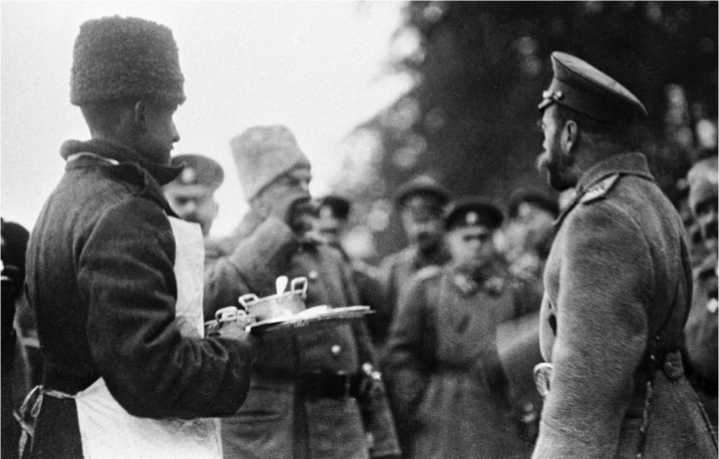 Император Николай II перед снятием пробы солдатского обеда в действующей армии