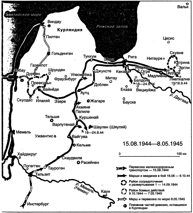 14-я танковая дивизия была подчинена 40-му танковому корпусу под командованием генерала танковых войск фон Кнобельсдорфа. Уже 15 августа ее прибывшие первыми панцер-гренадерские полки двинулись в направлении города Скаудвиле, а затем, миновав город Вайгува, устремились дальше на север в район южнее города Куршенай. Здесь, недалеко от впадения канала Вентос в реку Вента, гренадерские полки обеспечили охранение участка реки Вента по обе стороны от города Варпутенай и захватили небольшой плацдарм на восточном берегу реки. В течение дня 16 августа нашим гренадерам даже удалось незначительно расширить этот плацдарм. Однако вскоре выяснилось, что без основательной и занимающей много времени подготовки не удастся расширить плацдарм до такого размера, чтобы он мог использоваться в качестве района сосредоточения для всей дивизии. Поэтому, чтобы с самого начала не лишать атаку широкого размаха, было приказано, продолжая охранение достигнутых рубежей, отойти на север и от Куршеная наступать в юго-восточном направлении до шоссе Бубиай Шаулен. Панцер-гренадерская дивизия «Гроссдойчланд», которая до сих пор занимала этот участок, должна была в это же самое время выступить на Шаулен.