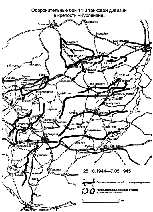 Командование 14-й танковой дивизии тотчас распорядилось немедленно подготовиться к предстоящему в скором времени выступлению. Подразделения дивизии покинули места своего расквартирования, оружие и боевая техника были погружены, а все обозы стянуты в опорные пункты и базы подразделений снабжения в районе Газенпота (Айзпуте). Наконец, в первой половине дня поступили первые приказы о передислокации в район Преекульна. Тем временем на всем протяжении фронта и немецкая артиллерия вступила в ответную перестрелку с артиллерией противника. Ее глухие залпы смешивались с более звонкими звуками разрывов русских снарядов, так что в воздухе стоял непрерывный то нарастающий, то затихающий гул и грохот. Волны взрывов заставляли землю содрогаться даже в тылу. Вскоре тяжелые снаряды дальнобойной артиллерии неприятеля стали падать в районе вокзала и дороги у Калвене и на шоссе, ведущем в Газенпот. Эскадрильи вражеских штурмовиков и бомбардировщиков выныривали из низко висящих облаков и сбрасывали свои бомбы на весь район дислокации дивизии, и прежде всего на лесной лагерь танкового полка, находившийся юго-восточнее Зелмени.