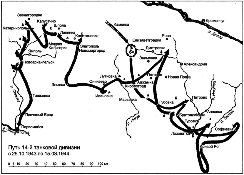 Поэтому 14-я танковая дивизия получила приказ взять под свою охрану находившуюся пока еще в наших руках территорию между этими двумя местами вклинения и отрезать от тыловых коммуникаций передовые танковые отряды красных, прорвавшиеся дальше всех на запад. Вслед за этим, действуя в составе 40-го танкового корпуса, вместе с 24-й танковой дивизией и с 3-й танковой дивизией СС «Тотенкопф» («Мертвая голова»), она должна была, атакуя на восток и юго-восток, уничтожить прорвавшегося противника и снова занять участок фронта в районе города Ингулец, чтобы создать здесь новый оборонительный рубеж.