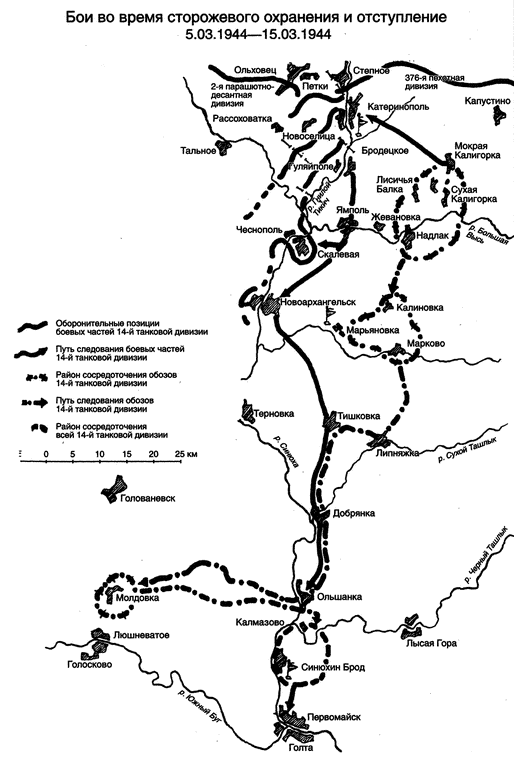 Нельзя было оставаться на месте еще и потому, что дальше, к западу мощные соединения 1-го Украинского фронта под командованием маршала Жукова тем временем атаковали Острополь и Шепетовку и уже сумели глубоко вклиниться в полосе обороны немецкой 4-й танковой армии. Нельзя было медлить с отходом также и потому, что в это же время на юго-востоке, где между реками Ингулец и Ингул 6-я армия отчаянно пыталась