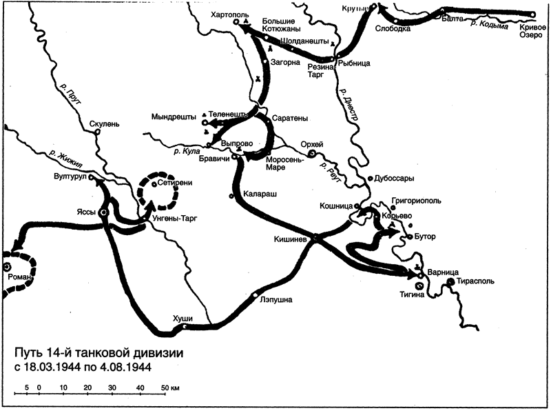 Однако неожиданно появившиеся группы противника постоянно мешали дальнейшей перегруппировке дивизии, поэтому сначала удалось занять только часть опорных пунктов, входивших в состав нового оборонительного рубежа. 108-й панцер-гренадерский полк не мог выполнить полученное ранее задание и установить связь с 24-й танковой дивизией в районе северо-восточнее города Яссы. Уже в ночь на 1 апреля ему пришлось повернуть назад и проделать обратный путь в сложных условиях по долине реки Чулук и горной дороге Дума Хогинешти. Вдобавок ко всем трудностям началась сильная метель, прервалась радиосвязь, нарушились все коммуникации, и любые передвижения войск были крайне затруднены. Целые взводы гренадеров от изнеможения падали на промерзшую землю. И сегодня, вспоминая события тех дней, нам кажется чудом, что, несмотря на все это, обессиленным бойцам удалось отбросить противника, прорвавшегося на южный берег Кулы, и закрыть брешь, образовавшуюся в линии фронта. Невозможно выразить словами, какое мужество, силу духа и самоотверженность, а также и чисто физическое напряжение сил продемонстрировали наши бойцы в этом бою, да и во всех предыдущих сражениях. Можно бесконечно говорить об этом в превосходной степени и все равно этого будет недостаточно, чтобы в полной мере оценить достигнутое ими.