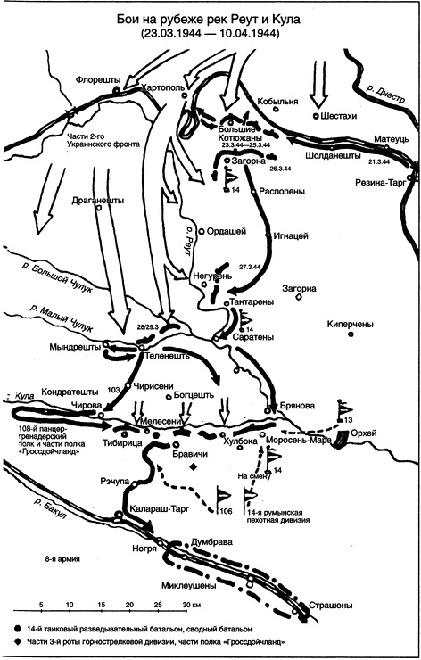 панцер-гренадерский полк, который ночью собрался в селе Теленешть, атаковал через деревню Микаласа село Чирисени, а затем и расположенное южнее село Чирова. Успех обеих операций превзошел наши ожидания. Зато атаку северной группы пришлось остановить уже 30 марта, так как командование корпуса приказало отойти к реке Кула с целью создания наконец прочного оборонительного рубежа.