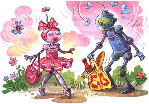 Когда Гоша впервые увидел Нюшу, он остолбенел и выронил из манипулятора сумку с продуктами. А Нюша равнодушно посмотрела на него и прошла мимо. С тех пор Гошу будто подменили. Он часами поджидал Нюшу во дворе, а когда она появлялась, давал целое представление: крутился на турнике, залезал на дерево или бросался помочь какой-нибудь старушке донести сумку. Дома Гоша становился рассеянным. Как-то в выходной день он вместо тарелок засунул в посудомоечную машину нашу обувь, а потом принялся пылесосить маму.