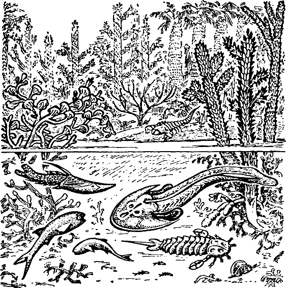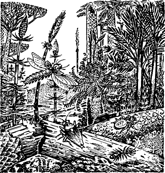 Однако в каменноугольном периоде на суше зашумели леса из древововидных растений. Леса эти были скорее похожи на болота, так как все растения стояли в воде. В это время можно было обнаружить стрекоз с размахом крыльев 70 сантиметров или метровую многоножку.