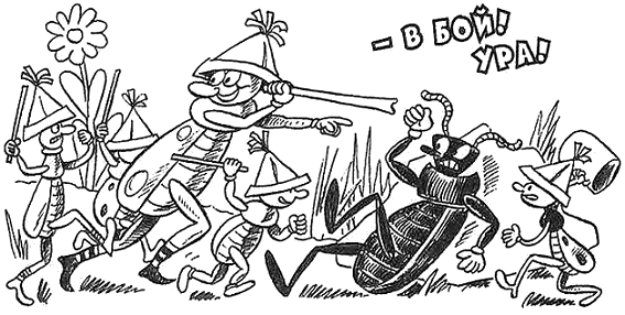 Эй, жучки и букашки! Вон чёрный враг, в атаку! выкрикнул он, как настоящий полководец, указывая на Хрущака.