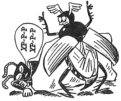 И вообще нельзя позволять всяким чучелам поднимать такой шум! загудел чёрный жук хрущак , которого разбудили в его норе.