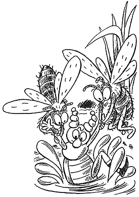 Догадываетесь, кто это был? Ну конечно, чёрный Хрущак со своей компанией. Пытлик не успел их разглядеть, потому что пчёлы уже окунули его в воду по самые усики. И только когда они летели обратно в улей, мокрый Пытлик с удивлением обнаружил, кто стоит прямо под ними.
