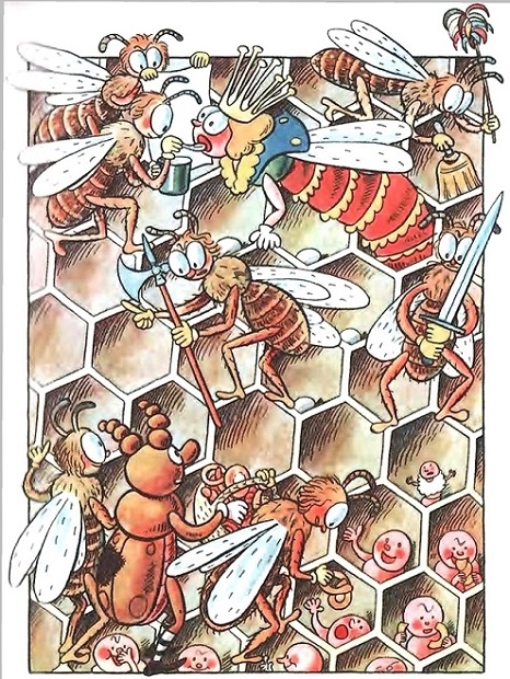 Некоторые личинки были ещё совсем крошечными, только что вылупившимися, как горошинки, таким пчёлы давали кашку и утирали им мордочки. Средним совали в рот бублики и баранки, а тем, кто постарше, давали в руку кулёк.